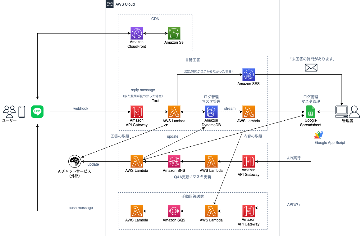 フロントエンド部分にLINE、バックエンド部分に AWSを中心に自然言語処理サービスや様々なSaaSを組み合わせた AI チャットボットパッケージを提供。お客様の要望に合わせてカスタマイズが可能で、構築・運用コストを最小限に抑えた構成にすることで、予算が限られたプロジェクトであってもLINEを活用した AI チャットボットの導入が行えます。
