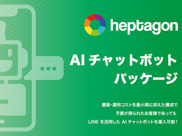 ヘプタゴンは構築・運用コストを抑えながら、AIを用いた自動応答が可能なLINE公式アカウントを導入したいお客様に対して「AIチャットボットパッケージ」を提供しています。