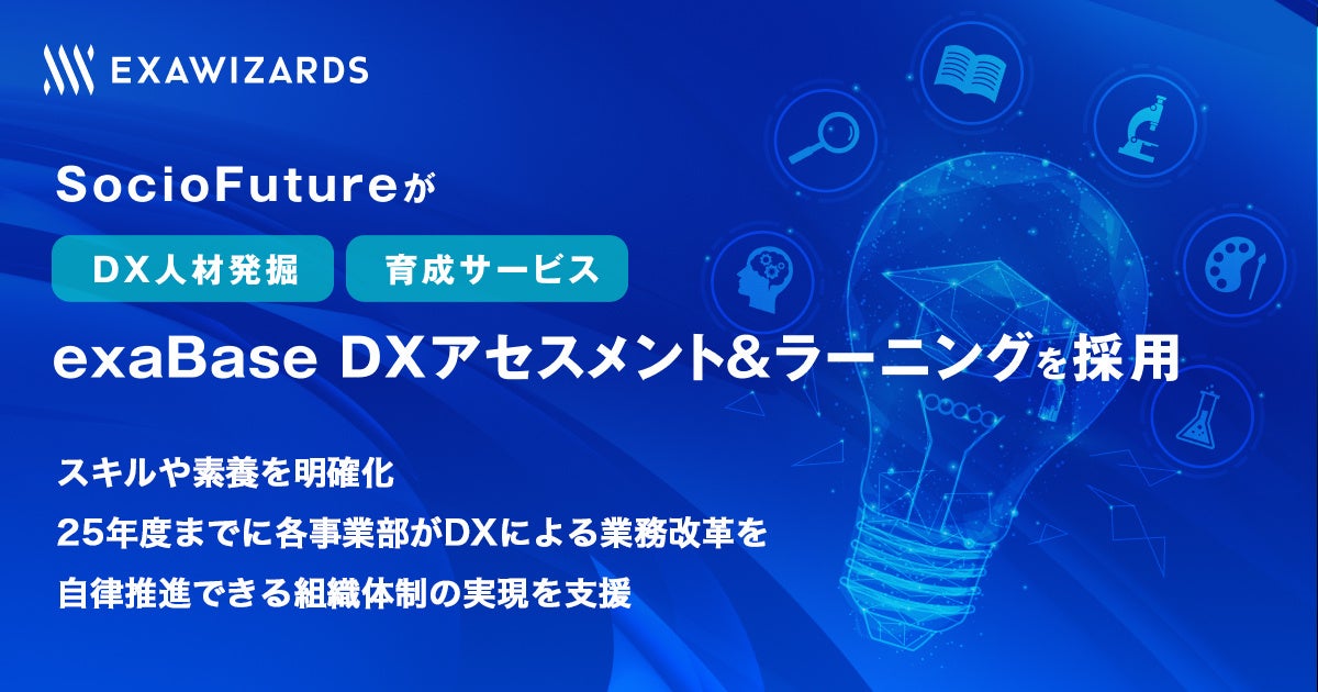 エクサウィザーズは、大手企業を中心に900社、6万人以上のDX人材育成を支援してきた経験やノウハウを活用しながら組織の目指す姿に応じた最適な育成コンテンツ・プログラムを展開しています。今後も、exaBase DXアセスメント&ラーニングの提供によりDXを推進・牽引する人材を継続的に輩出し続ける仕組みづくりを支援することを通じて、SocioFutureにおける全社DX推進体制の実現に貢献していきます。