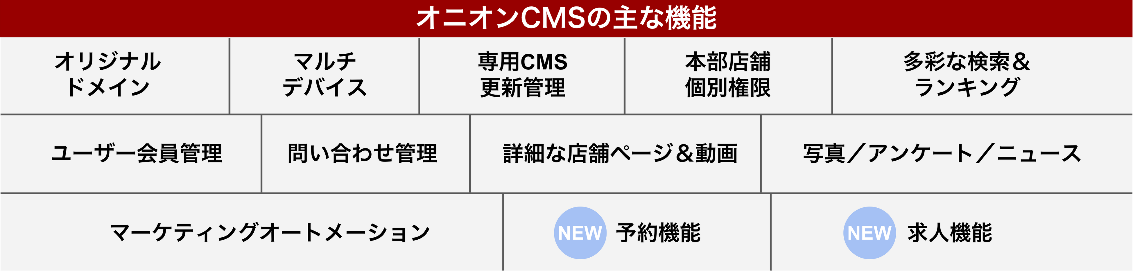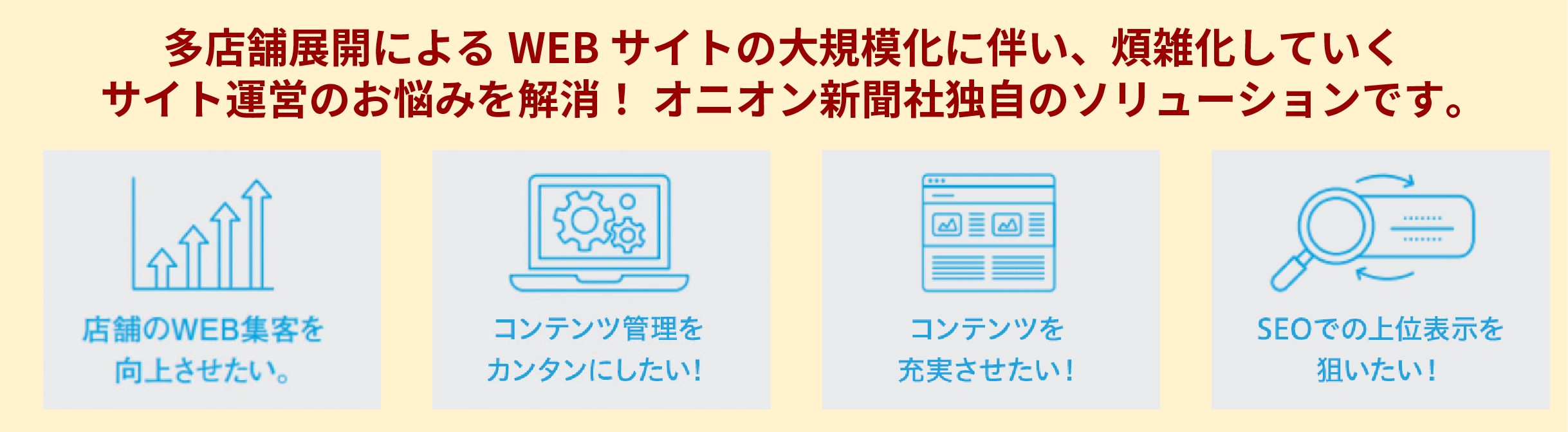 オニオンCMSとは、大手ポータルサイトレベルのチェーン店様向けサイト構築から、店舗ページ毎のコンテンツ管理、エリアSEO、問い合わせ・予約管理まで、チェーン店様の店舗集客のサポートを可能にした「クラウド型CMSサービス」です。