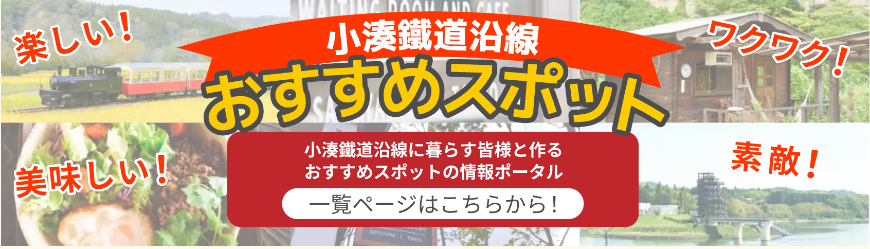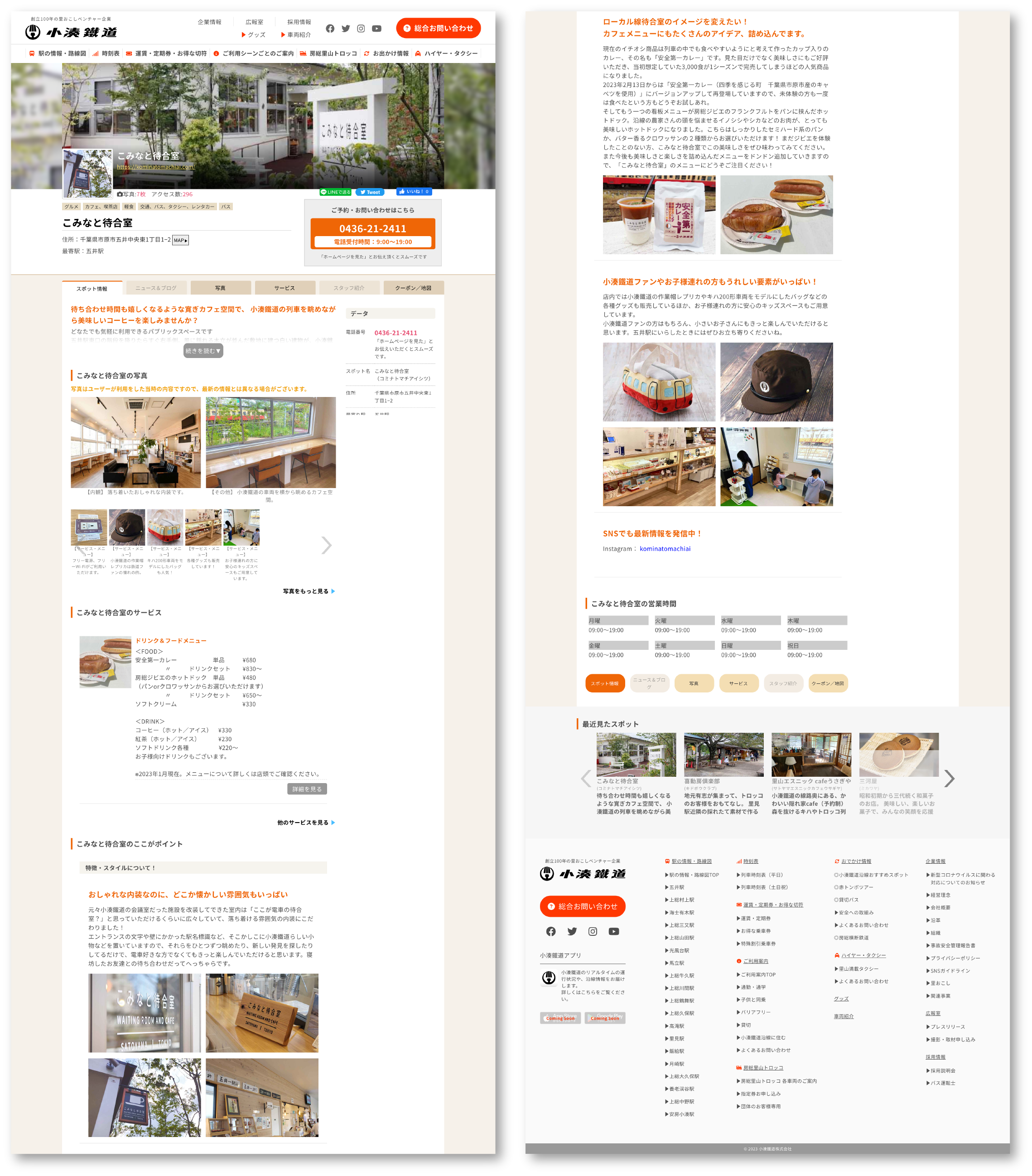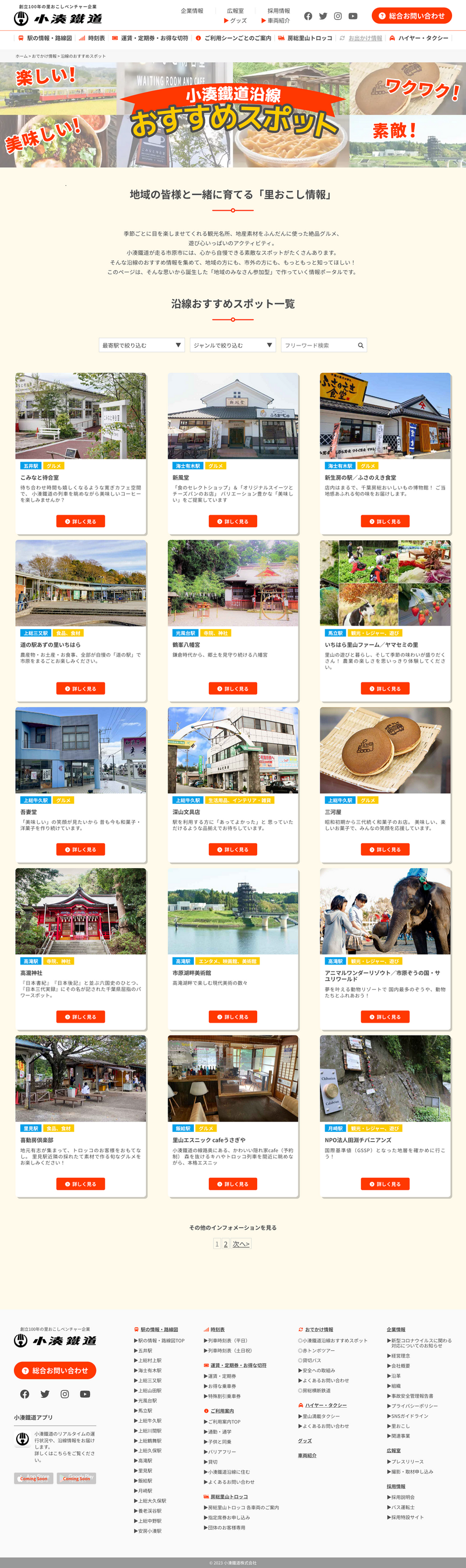 「小湊鐵道沿線おすすめスポット」コーナーへは、TOPページ中段のバナー(下の画像)よりアクセス。最寄り駅、ジャンル等での検索が可能で、スポット詳細ページでは参加店舗・企業の情報を多くの写真と共に紹介。またブログ機能による新着情報公開やクーポン配信機能を使ったPR活動などにも活用可能です。