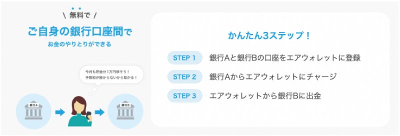 また、ユーザーは『COIN+』を組み込むデジタル口座管理・決済アプリ『エアウォレット』を利用することで、連携済みの金融機関間において手数料無料でお金を移動することが可能です。住信SBIネット銀行と連携することで今まで以上により便利に自身のお金の管理ができるようになります。