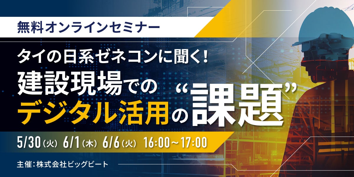 BtoB企業のマーケティング支援を行う広告会社、株式会社ビッグビート(本社:東京都千代田区)は2023年5月30日(火) 6月1日(木) 6日(火)に、ウェビナー「タイの日系ゼネコンに聞く!建設現場でのデジタル活用の”課題”」を開催します。