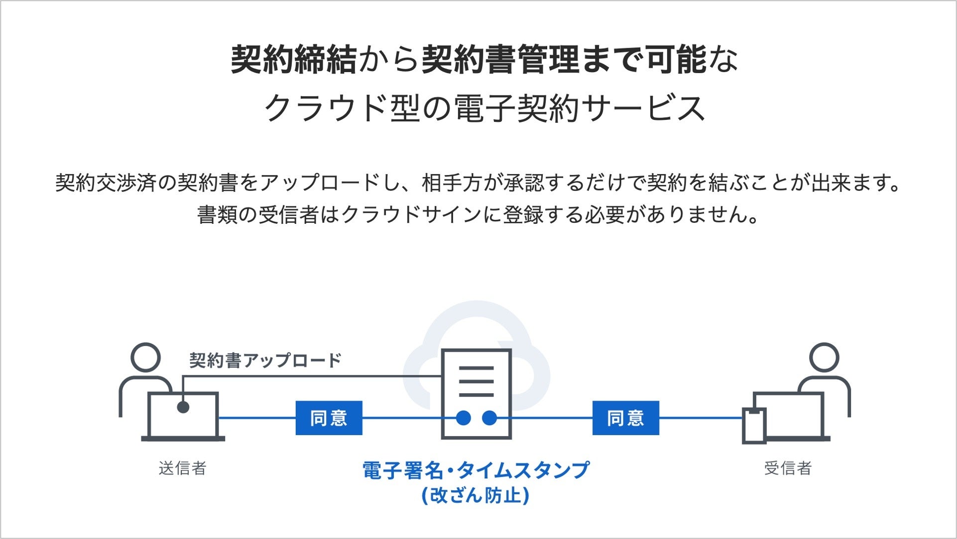 クラウドサインは、「紙と印鑑」を「クラウド」に置き換え、契約作業をパソコンだけで完結できるWeb完結型クラウド契約サービスです。全てがクラウド上で完結するため、契約締結のスピード化とコスト削減を実現します。電子契約機能は、「いつ・誰が・どの契約に合意したか」を証明する厳格な電子署名とタイムスタンプを付与します。リモートワークの環境下においても契約書の証拠力を担保しながら、事業活動に重要となる円滑な契約業務を可能にします。2015年の提供開始以来、企業や自治体などで幅広く導入されている、電子契約市場No.1の電子契約サービスです。