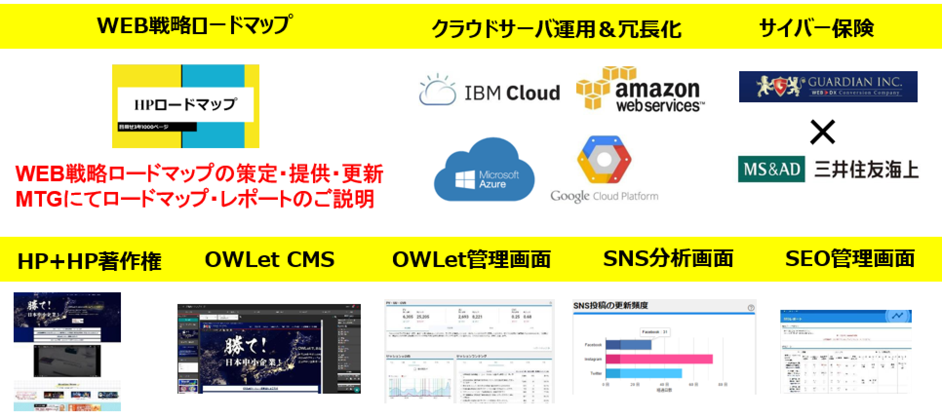 機能面においては、業界他社を圧倒するレベルの全方位機能群を装備しており、WEB戦略を実践していく上で、CMS、アクセス解析、SEO、SNS、コンテンツ作成、コミニュケーション、サイバー保険など、今後必要となるあらゆる要素を備えております。また、コンテンツの文章もガーディアンでライティングした上でご提供いたします。