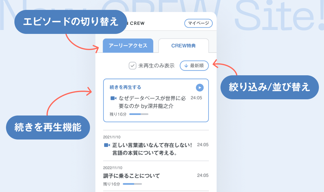アーリーアクセスとCREW特典を、タブで切り替えできるようになりました。