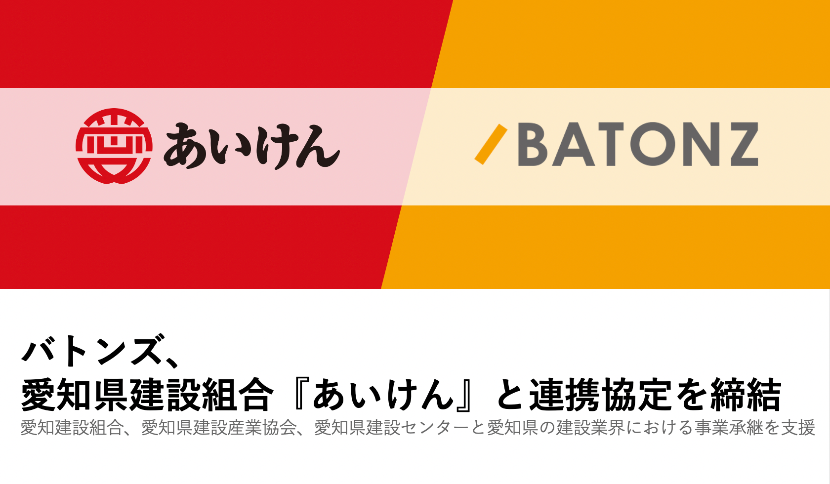 後継者のいない愛知県内の建設事業者における第三者承継・M&Aを推進するため、愛知建設組合、愛知県建設産業協会および愛知県建設センターの連合体である『あいけん』とバトンズが連携し、事業承継支援ネットワークを強化します。『あいけん』は、大工、左官、建具、石工、とび、造園など建設に関係する方々約10,000名が加入し、愛知県における建設業の中心的団体として大きな役割を果たしています。建築業向け一人親方労災、中小事業主労災保険などを中心に、法務相談、労務相談サービスを提供しており、この度、事業承継支援について開始すべくバトンズと連携協定を締結します。