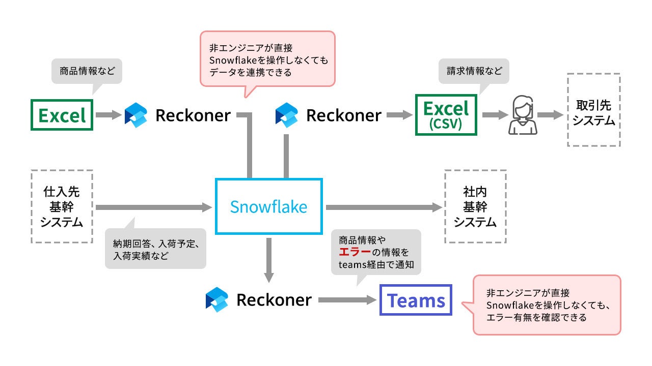 長年行ってきた紙ベースの仕事をデジタル化するため、基幹システムのリプレースに着手。ERPパッケージを選定しましたが、それだけでは仕入先・取引先とのデータ連携ができない問題に直面しました。ノーコード型ETLツール「Reckoner」とDWHの 「Snowflake」を導入し、限られた予算及び準備期間の中で複数のデータ連携を実装しました。