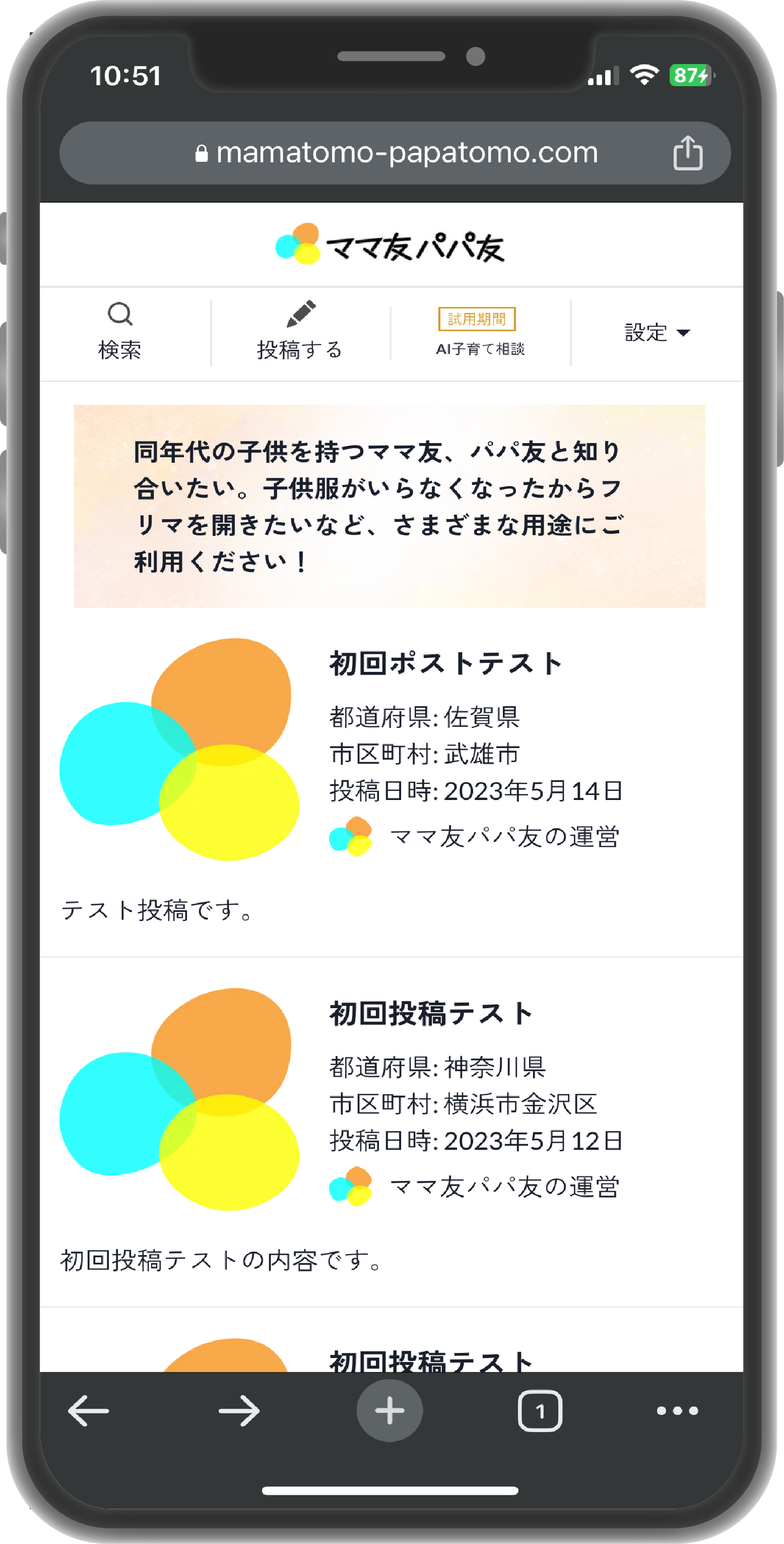 「ママ友パパ友」は、都道府県、市区町村で検索可能な掲示板形式のウェブアプリです。