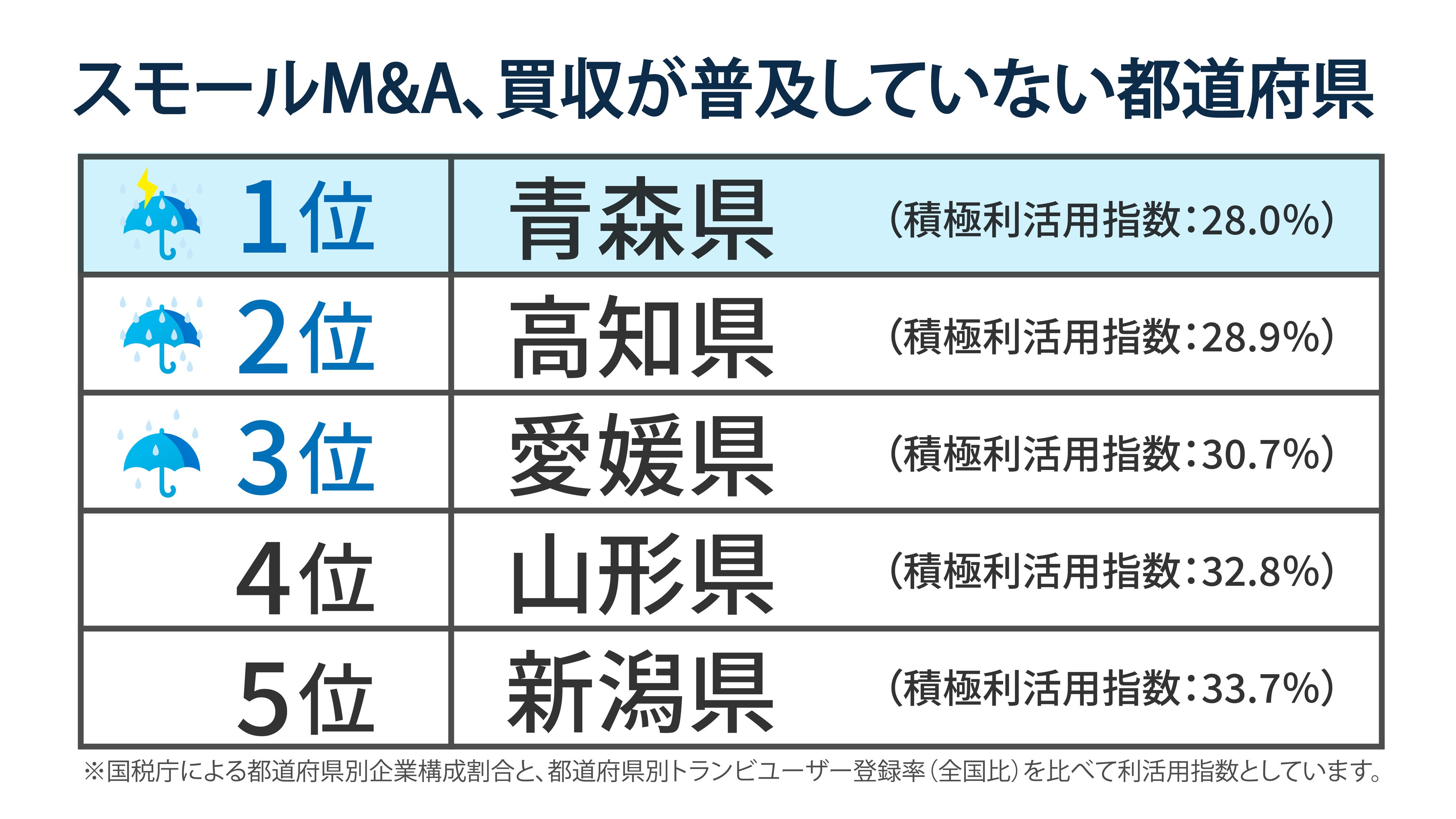 1位の青森は利活用指数が28.0%、2位の高知は28.9%、3位の愛媛は30.7%となりました。それぞれの県について、M&A案件の都道府県ごとの掲載割合についても同様に低かったため、買い手側と売り手側のどちらかが増えることで相乗効果としてお互いが増えるという循環がまだうまく機能していないことが要因として挙げられます。