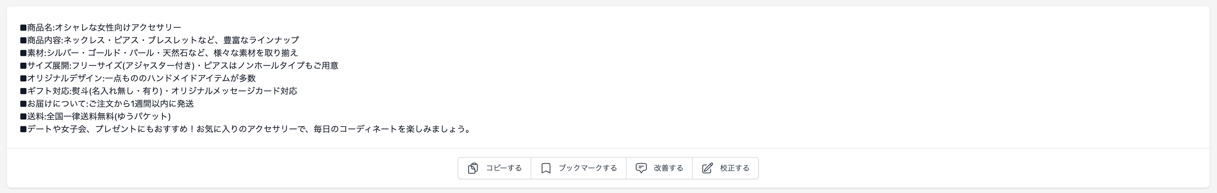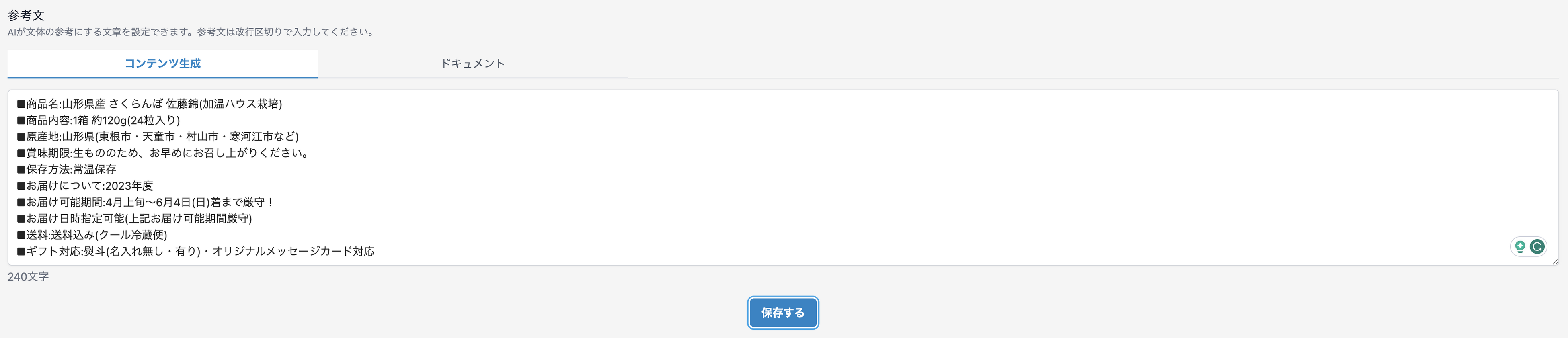 その上で、コンテンツ生成画面からコンテンツを生成すると、上記で設定した参考文の文体に近い文章を生成することが可能です。