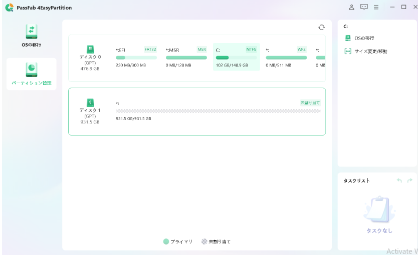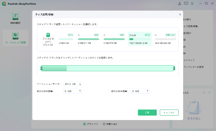 PassFab 4EasyPartition を使用してパーティションのサイズ変更/移動を行う方法は以下の通りです: