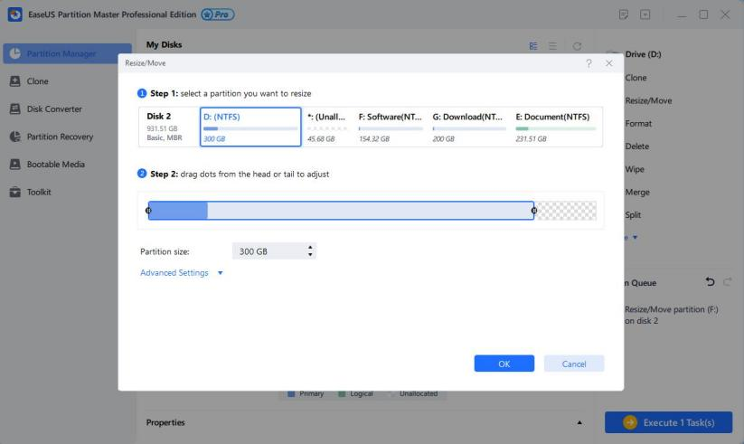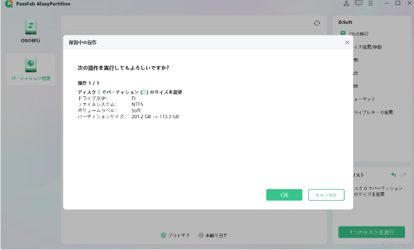 Step4:「OK」をクリックして操作を実行します。「1つのタスクを実行」をクリックし、操作を再度確認します。最後に、「OK」をタップし、パーティションのサイズ変更/移動を完了します。