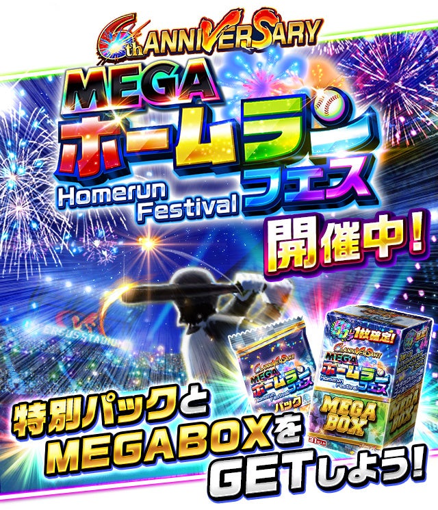 ※「MEGAホームランフェスパック」「SSレア1枚確定!6th ANNIVERSARY MEGAホームランフェス MEGA BOX」のプレゼント受け取り対象者は期間中にミニゲーム「ホームランフェス」をプレイした方となります。