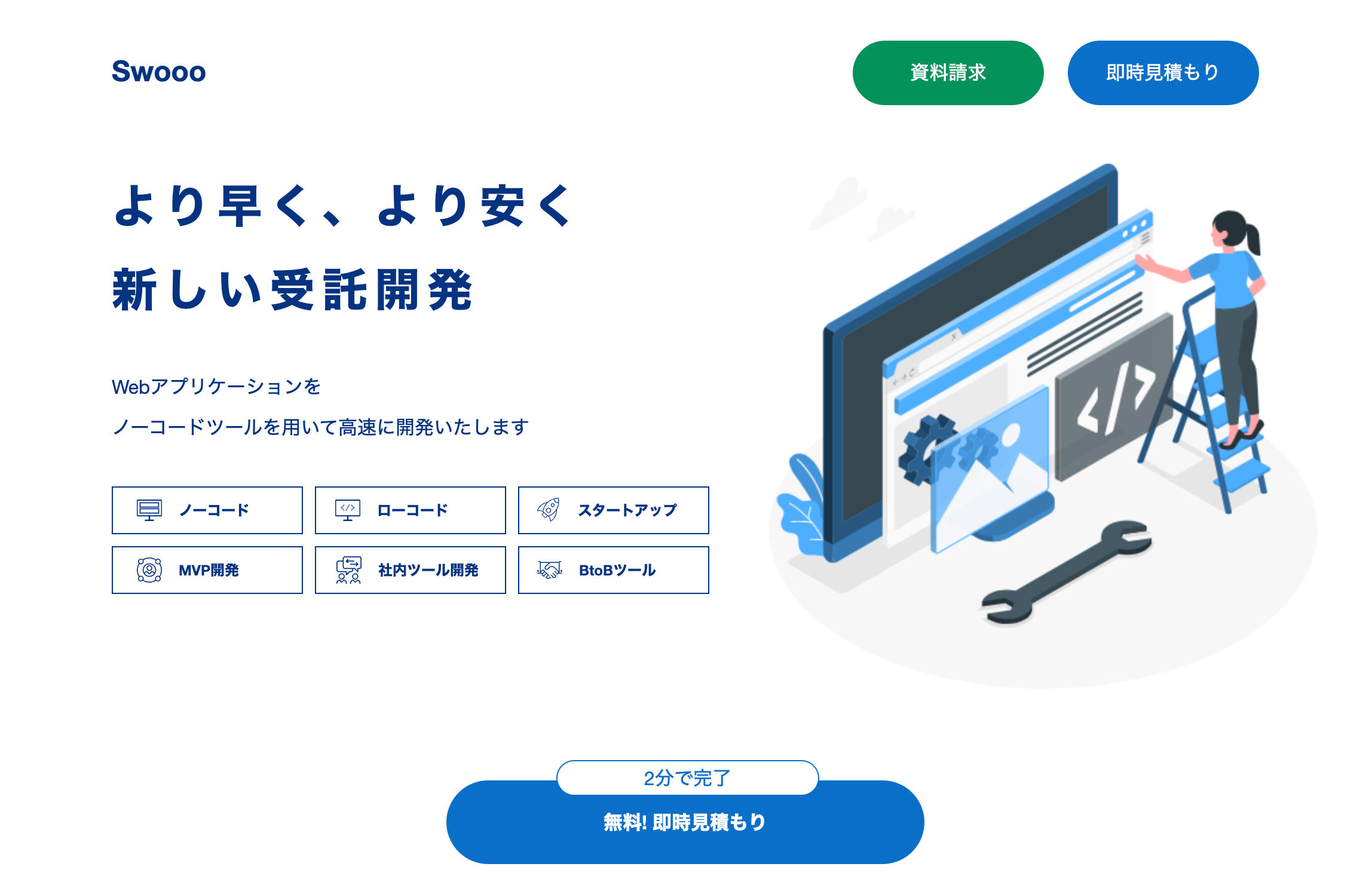 Swoooは、「コーディング不要のノーコードツールを活用し、従来よりもコストを抑え、そして早く実現させる」webシステム開発サービスです。