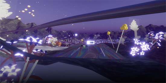 《未踏のツアー》は、福島県西会津町を元に作られたCGの街をツアー形式で踏破する映像インスタレーションです。菅野は、自身では訪れたことのない福島県西会津町に関係する物語を、小説やウェブ上の広報誌、住民とのビデオ通話を通して集めました。そしてこの地の3DCG模型を作成し、集めた資料に基づいて様々な物語を埋め込みました。このCG模型は、現実の西会津町が完璧に反映されたものではありません。しかしこの中を物語と共に巡ると、土地に馴染みの深い鑑賞者も、またそうでない鑑賞者も、割合は異なるにせよ、時に懐かしく時に奇妙な感覚を覚えることになります。そこには、現実の土地と紐づけられながら同時に遊離した、あらたに土地の記憶や物語を紡ぐ場としての可能性が秘められています。