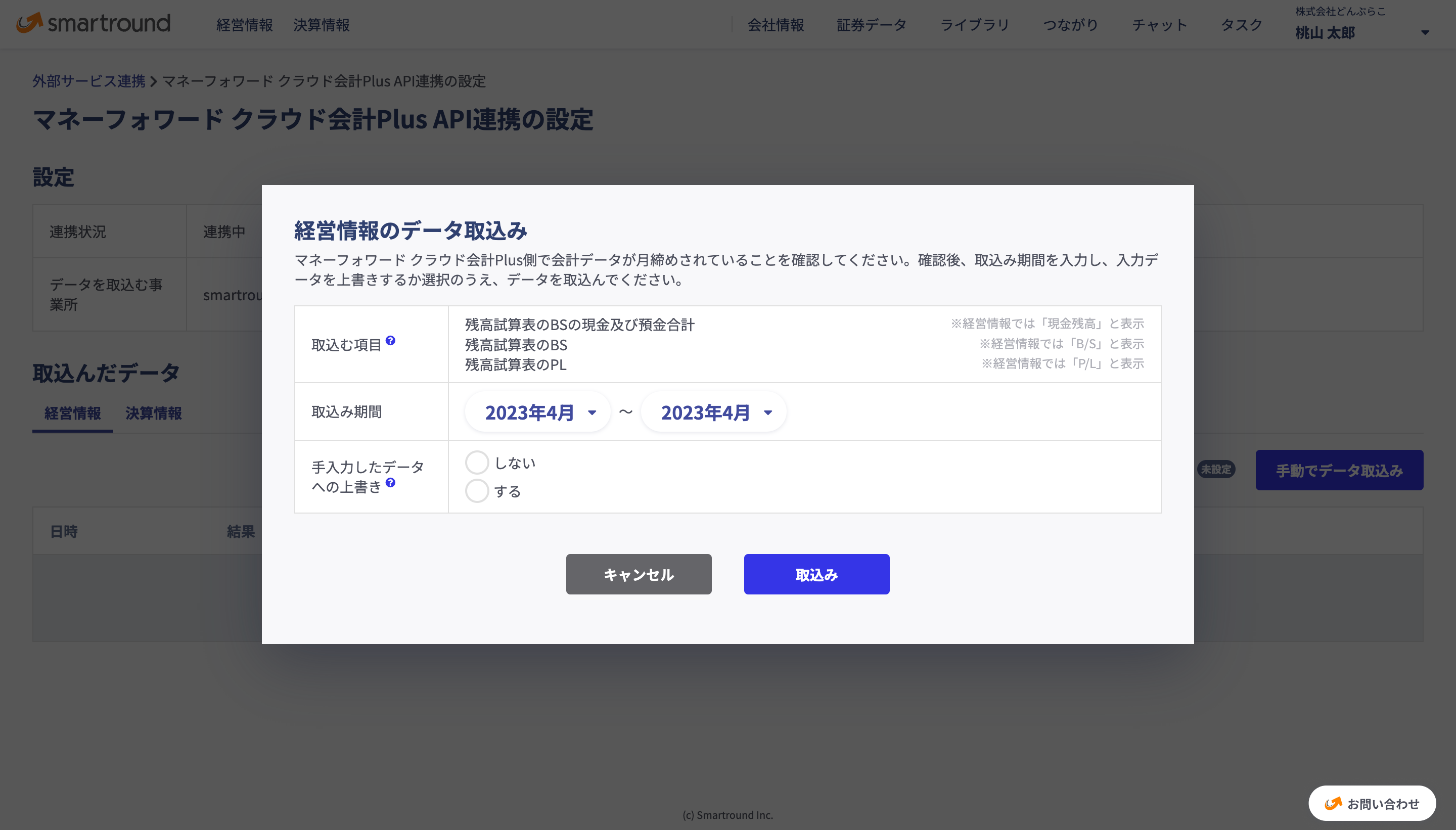 「経営管理smartround」の「外部サービス連携」より、API連携を設定し、対象期間を指定して取り込むことで、「マネーフォワード クラウド会計Plus」の試算表データを反映できます。反映したデータをもとにバーンレートやランウェイを自動計算し、ダッシュボードに自動でグラフ表示することができます。