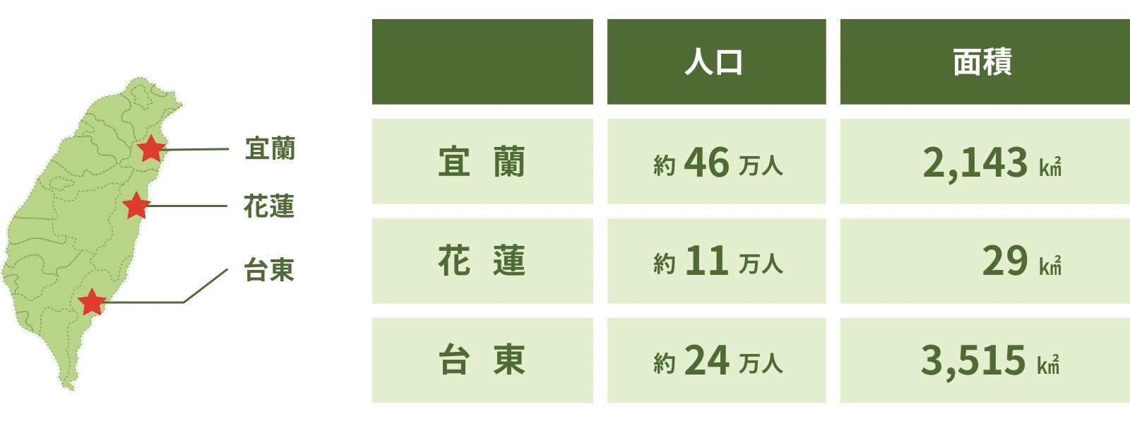 台湾東海岸三大都市の宜蘭(イーラン)・花蓮・台東のことを総じて「東台湾」エリアとして現地で一般的に認知されています。東台湾は観光関連業をはじめサービス業が経済の中心となっており、特に宜蘭(イーラン)、花蓮、台東の3つの都市は特徴的な地形が生み出す美しい風景や現地の雰囲気を色濃く感じられる夜市が人気の観光地です。