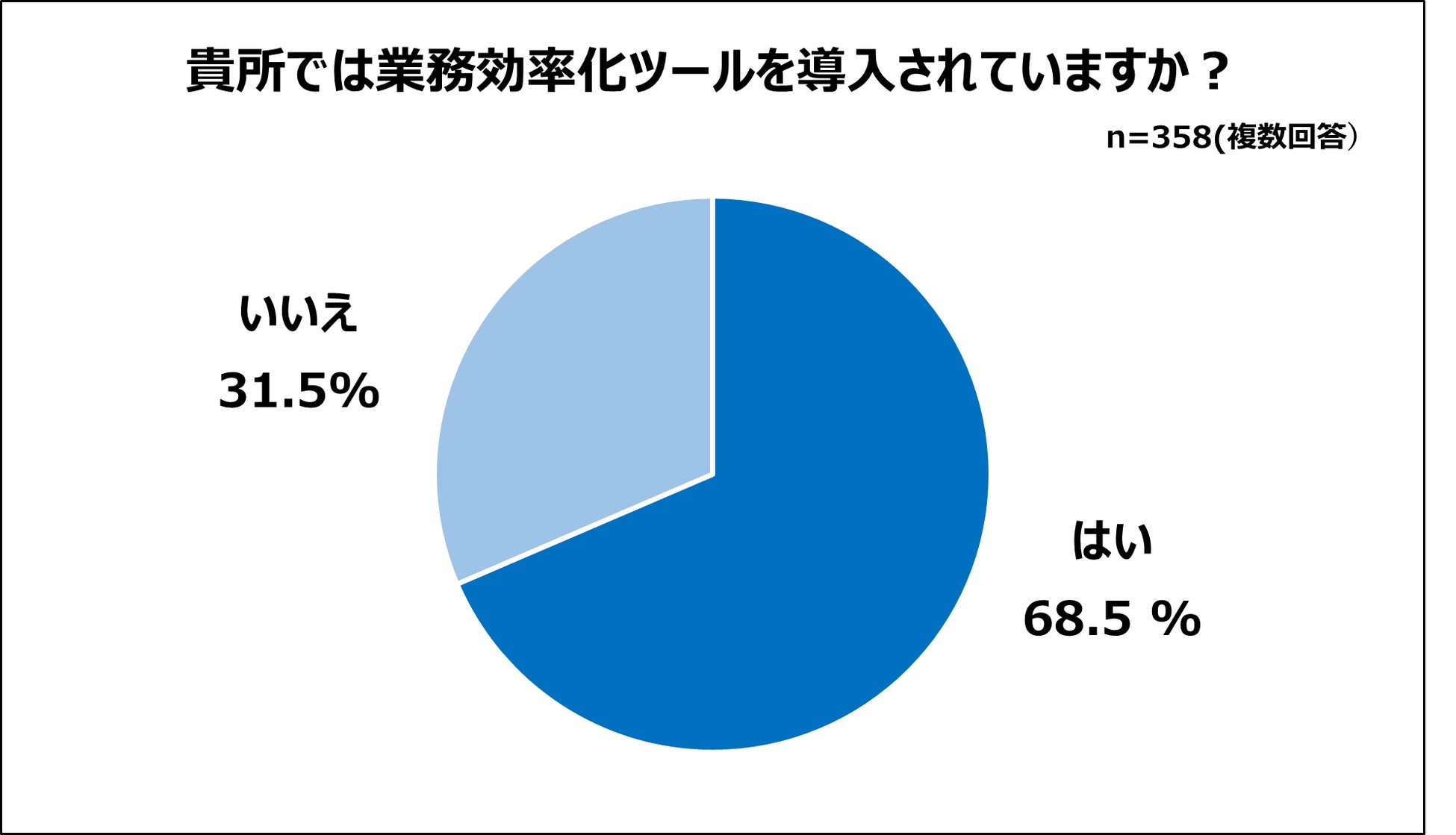 続いて、「貴所では業務効率化ツールを導入されていますか?」という質問をしたところ、『導入している(はい)』(68.5%)という回答が全体の約7割を占めました。2021年に当社が実施した同様の調査では業務効率化ツールを導入していると回答した人は24.5%で、この2年間で業務効率に対する意識が大きく変化していることがわかりました。