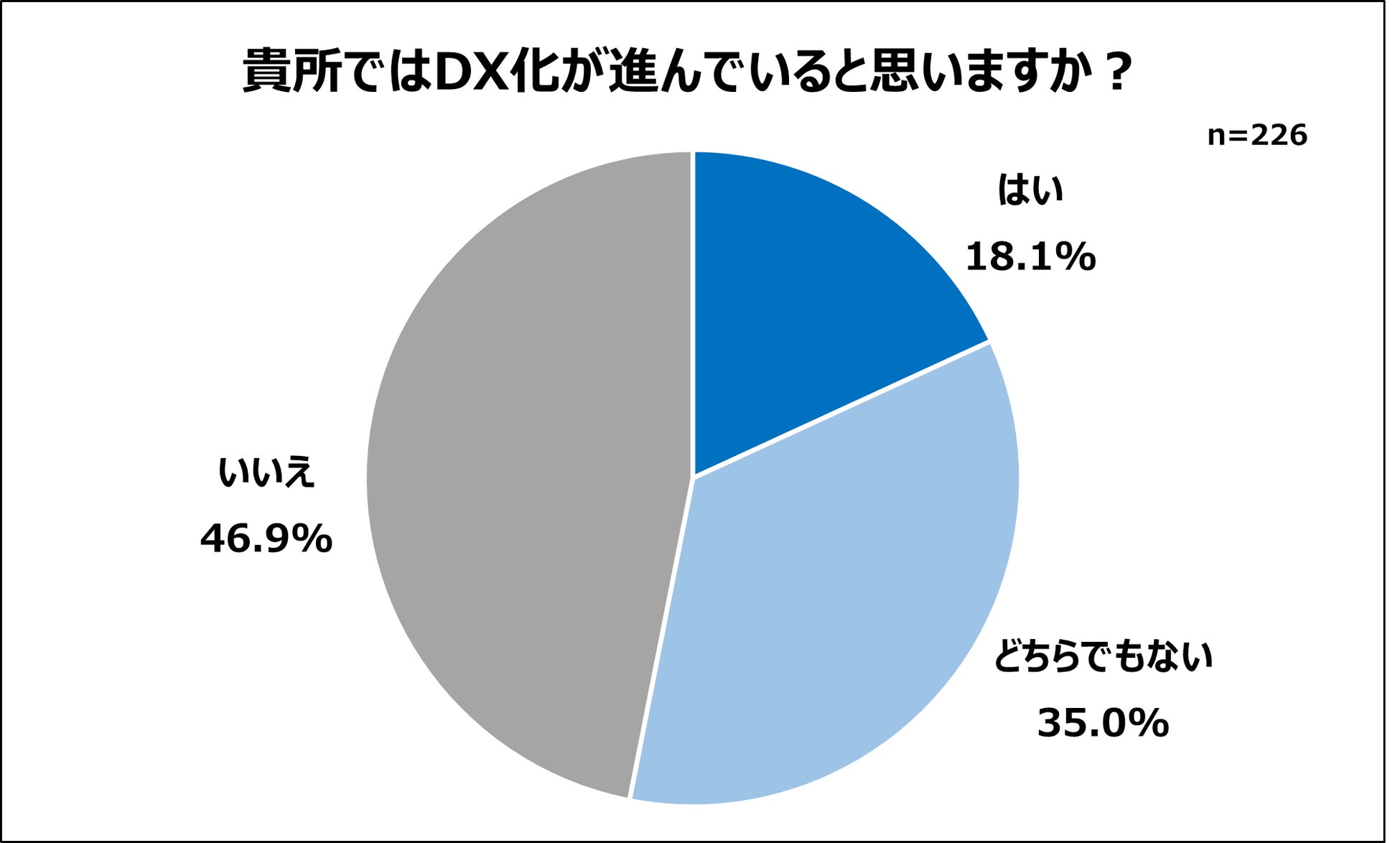 最後に、「貴所ではDX化が進んでいると思いますか?」という質問をしたところ、『進んでいる(はい)』(18.1%)、『どちらでもない』(35.0%)、『進んでいない(いいえ)』(46.9%)という結果になりました。最多となった事務所でのDX化が進んでいないと回答した人からは