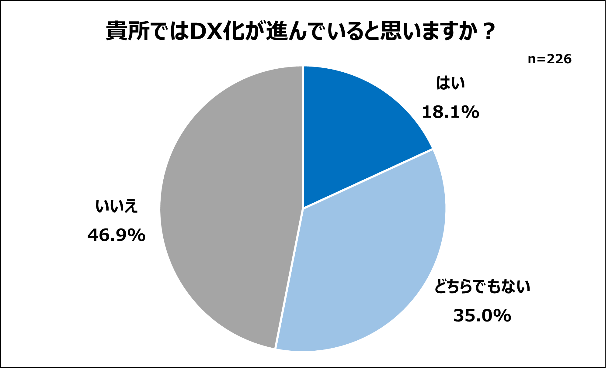 最後に、「貴所ではDX化が進んでいると思いますか?」という質問をしたところ、『進んでいる(はい)』(18.1%)、『どちらでもない』(35.0%)、『進んでいない(いいえ)』(46.9%)という結果になりました。最多となった事務所でのDX化が進んでいないと回答した人からは