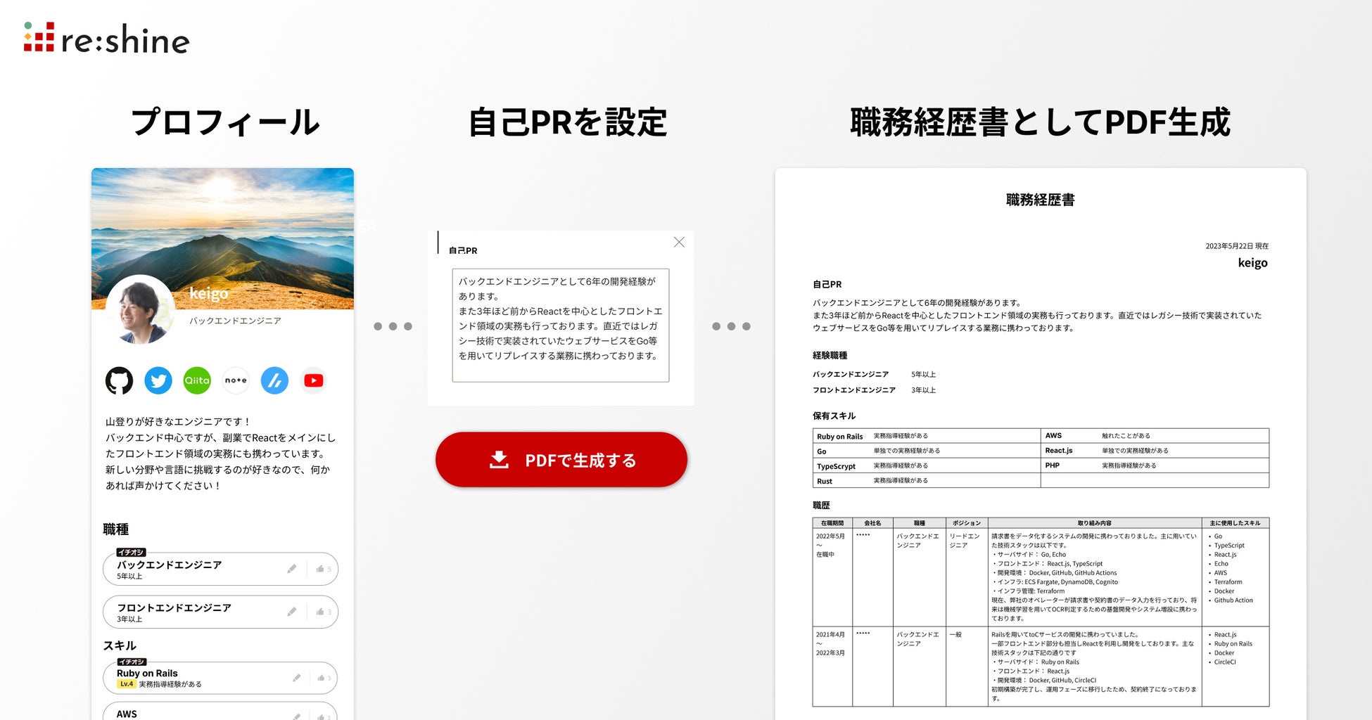 「re:shine」上に登録されたスキルやポートフォリオなどのプロフィール情報を基に、職務経歴書を生成します。生成された書類はダウンロードできるため、そのまま提出することも可能です。