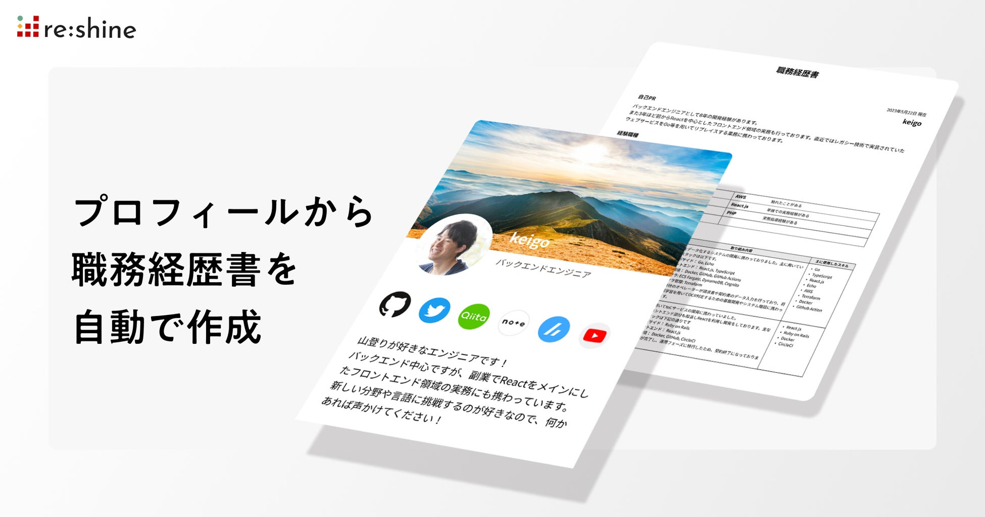 今回提供を開始する新機能は、フリーランスが仕事を獲得するために行う営業活動を効率化するためのものです。フリーランスの営業活動では、発注側の企業に対して「職務経歴書」を提出する必要があります。しかし、初めて作成する際には時間がかかることに加え、既に作成済みの書類を都度更新するにも手間がかかります。そのような書類作成における負荷軽減のため、「re:shine」内に登録されたスキルやポートフォリオなどのプロフィール情報から自動的に職務経歴書を作成できる「レジュメ生成機能」の開発に至りました。