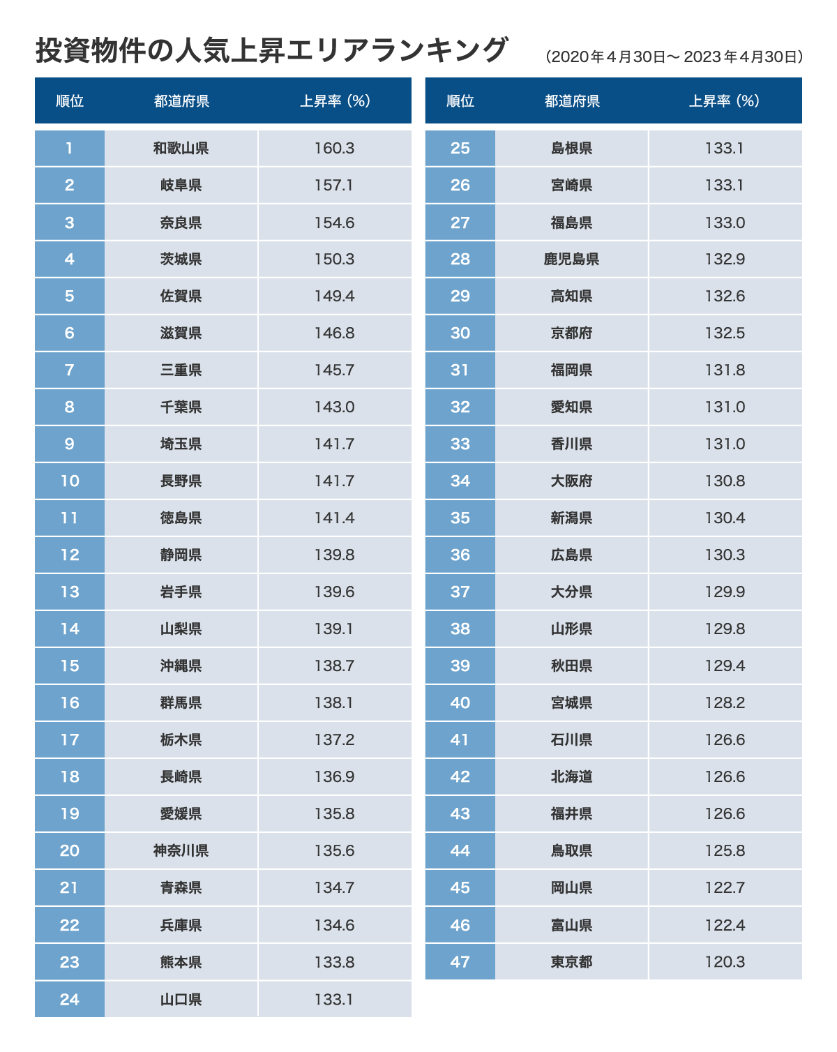 最下位は東京都という結果に。元々人気のエリアのため、本ランキングの指標である「上昇率」という点では伸び悩んだとみられます。