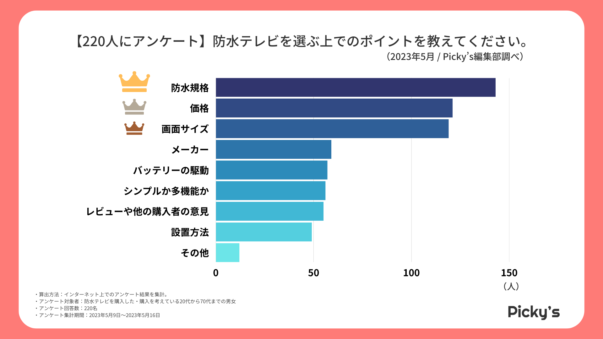「Picky’s」は、インターネットショッピングにおいて、購入前に試せない・選ぶべきものがわからないという課題の解決を目標に、あらゆる商品のおすすめランキングや検証レビューを紹介するサイトです。このたびPicky’s(https://rentry.jp/note/)では、防水テレビについてインターネット上でアンケート調査を行いましたので発表いたします。