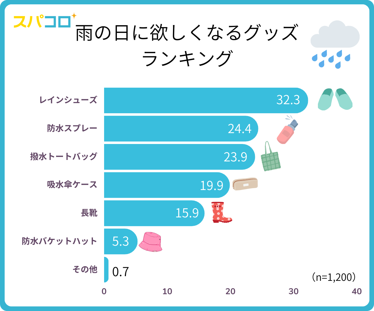 雨の日に欲しくなるグッズTOP5は「レインシューズ」(32.2%)、「防水スプレー」(24.4%)、「撥水トートバッグ」(23.9%)、「吸水傘ケース」(19.9%)、「長靴」(15.9%)でした。