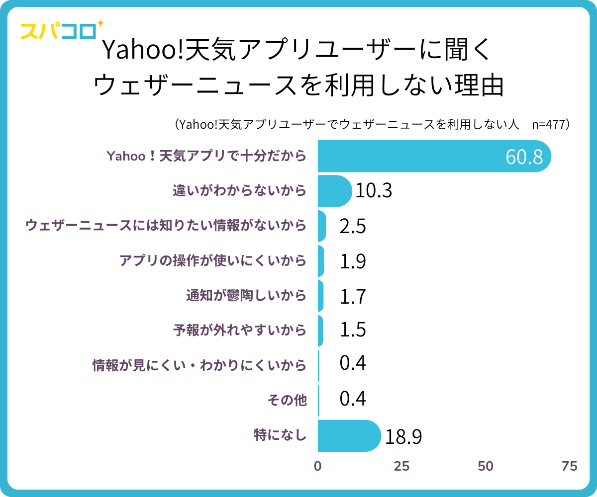 ウェザーニュースアプリを利用しない理由TOP5は、「Yahoo!天気アプリで十分だから」(69.6%)、「違いがわからないから」(10.3%)、「ウェザーニュースには知りたい情報がないから」(2.5%)、「アプリの操作が使いにくいから」(1.9%)、「通知が鬱陶しいから」1.7%でした。