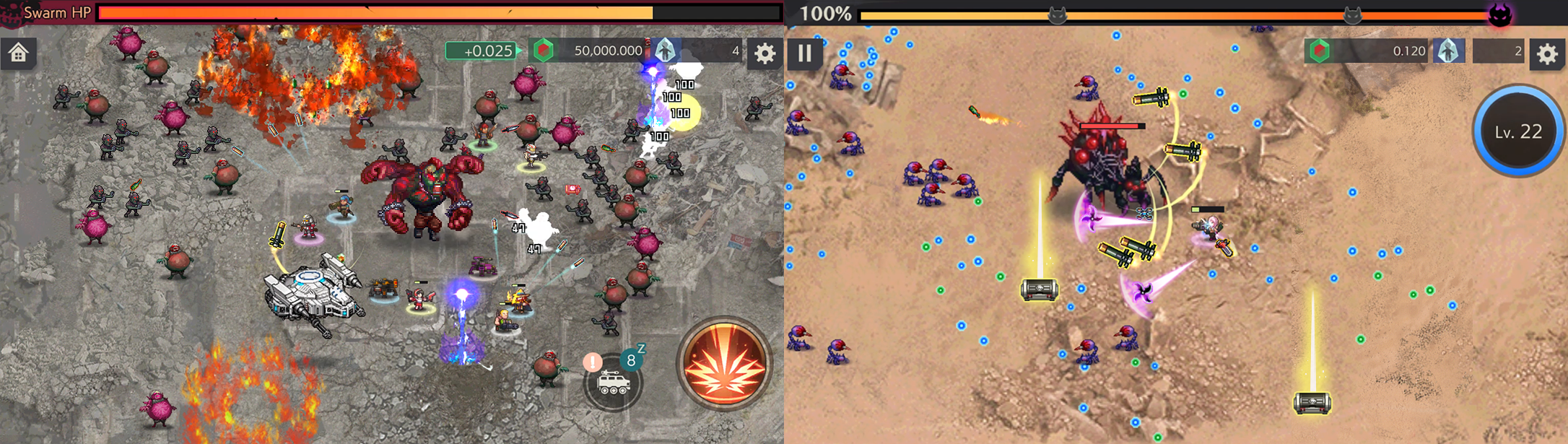 大量の敵を一斉に蹴散らすサバイバルゲームの爽快感に、「コア」をザクザク回収する爽快感が加わり、より爽快なゲーム体験が味わえます。