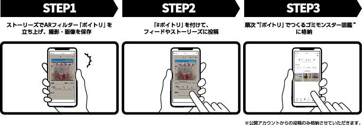 FacebookやInstagramのストーリーズ機能で使用できる『ポイトリ』は、ポイ捨てゴミを“モンスター”に見立てて名前や発見場所、エピソードなどと一緒に投稿することができるARフィルターです。撮影後は、#(ハッシュタグ)を付けて投稿することで、“「ポイトリ」で作るゴミモンスター図鑑”のFacebookグループアルバムに順次格納され、図鑑のデータをつくることができます。普段見て見ぬ振りをしてしまうポイ捨てゴミに注目する機会を提供することで楽しくクリーン活動に参画し、SDGsアクションに取り組むきっかけをつくることができます。