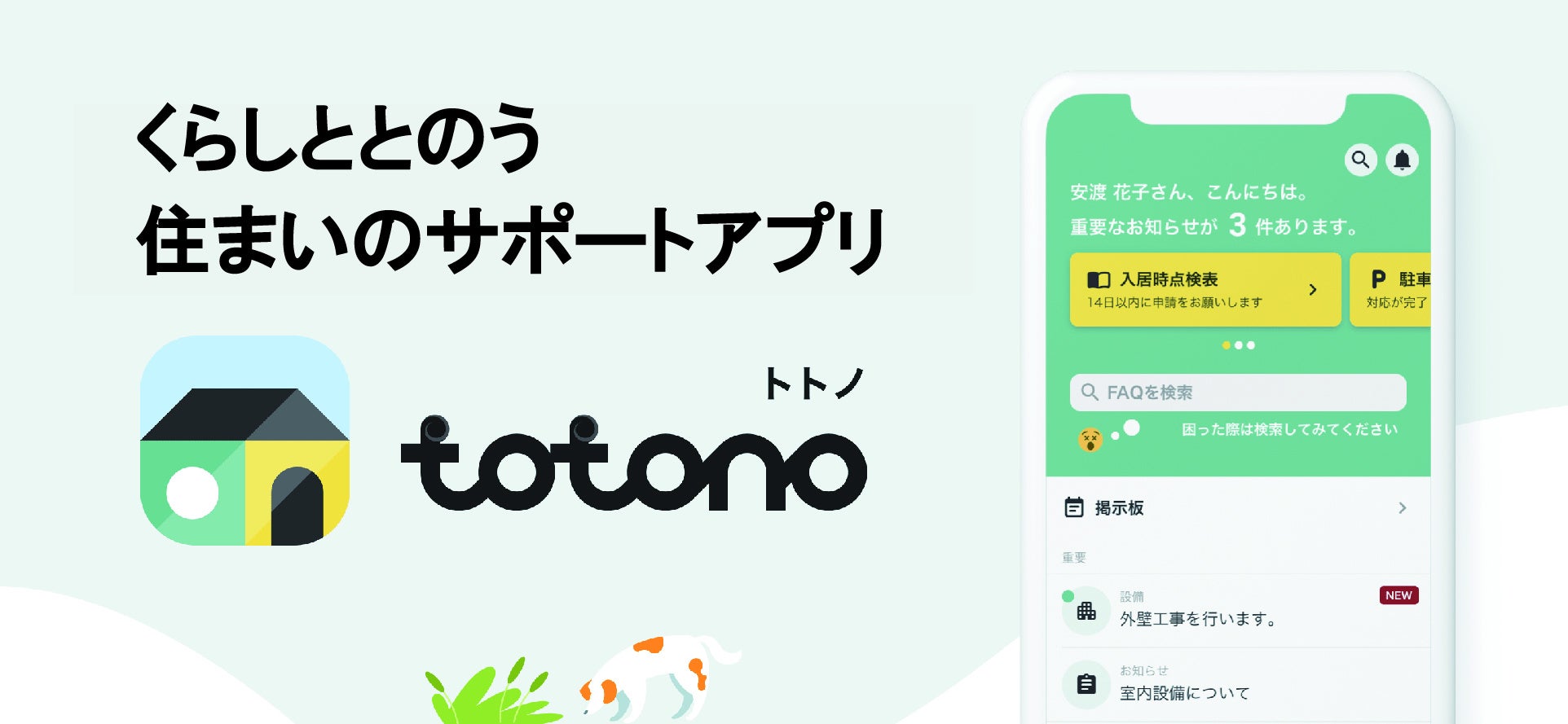 入居者アプリ「totono」は、不動産管理会社と入居者を繋ぐスマートフォンアプリケーションです。入居者はこれまで不動産管理会社とのやりとりは電話や書類手続といった手段に限られていましたが、入居者アプリ「totono」を利用することでアプリ内から契約内容が確認でき、不動産管理会社への問い合わせや各種申請もアプリ内で行うことが可能になります。また、不動産管理会社にとっては情報の一元管理や電話対応の抑制、ペーパーレスに繋がり、入居者満足度向上と業務効率化を同時に実現します。