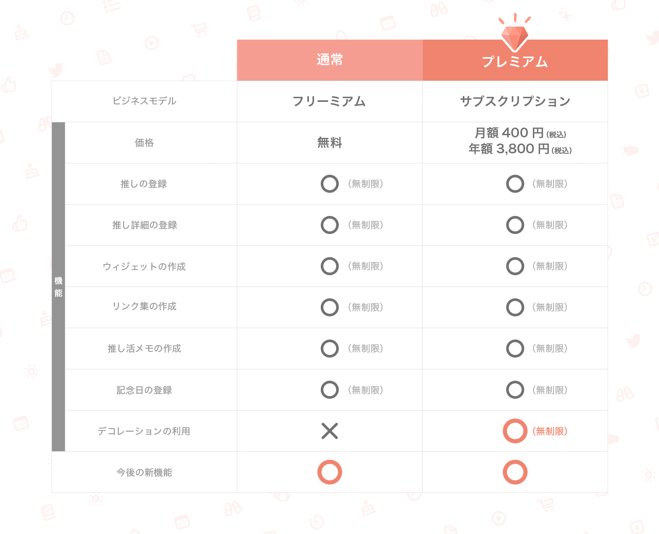 『プレミアム』は、アプリ内に追加されたサブスクリプションの利用プランです。今後さまざまな機能をリリース予定です。今回、第1弾としてデコレーション機能をリリースしました。なお、これまでリリースを続けてきた機能は、引き続き通常のプラン(フリーミアム)として制限なく利用できます。