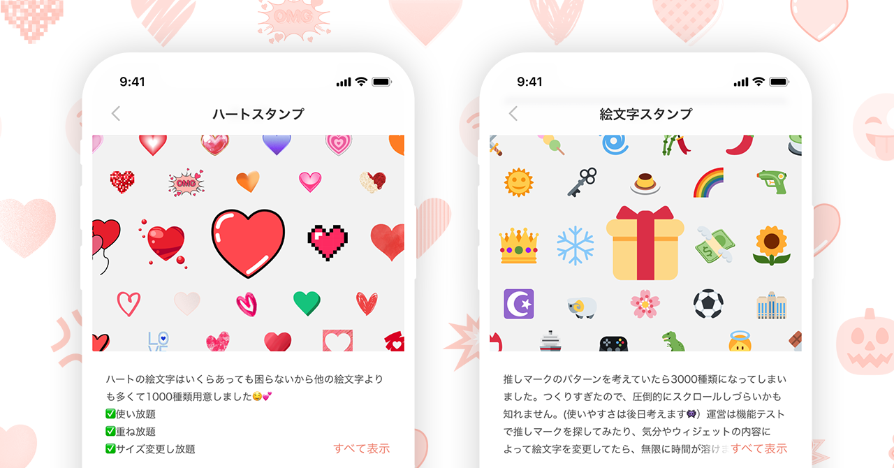 デコレーションの第1弾のコンテンツは、1,000個以上のハートスタンプ、推しマークや気持ちを表現しやすい3,000種類の絵文字を用意しました。