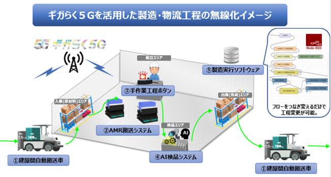 そこで、本実証では製造実行ソフトウェア(MES)※2上に、ギガらく5G上で動作する全機器の制御・状態監視信号を入出力するAPI機能や、これら機器制御・状態監視信号を最新状態で保持するデータベース機能、ローコードソフトウェア(Node-RED ®※3)によるシステム動作を可視化しソフト改変しやすい保守開発環境を設け、可用性を検証します。この取り組みにより、製造物流現場において、生産管理や品質向上のため製造工程変更が求められる時に柔軟性・即時性の高い現場改善を可能とすることを狙います。