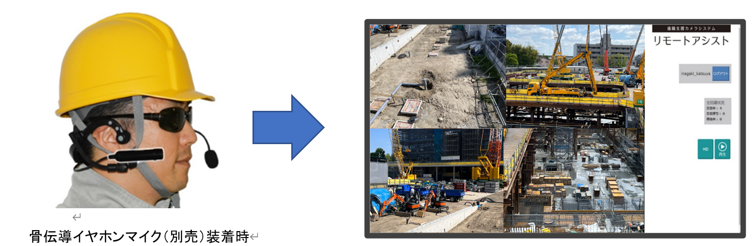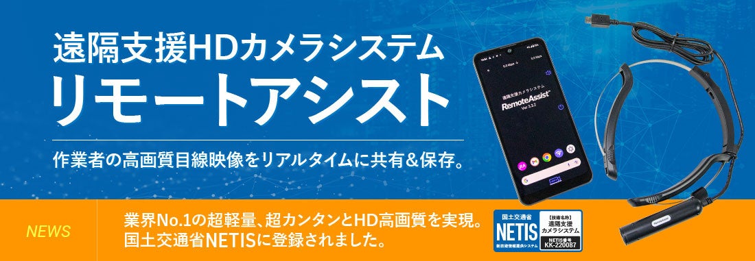 リモートアシストは、ウェアラブルカメラと5G対応のAndroid端末を使用して、カメラを装着している人と遠方のパソコンを結び、映像と双方向音声を共有できるシステムです。事務所から現場作業者への遠隔支援を簡単な操作で行うことができます。特に国土交通省が推奨する「遠隔臨場」用のカメラシステムとしての要件を満たし、新技術活用システムNETISに登録されたことにより「建設現場業界における2025年問題」の対策として期待されています。