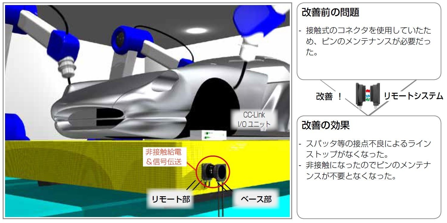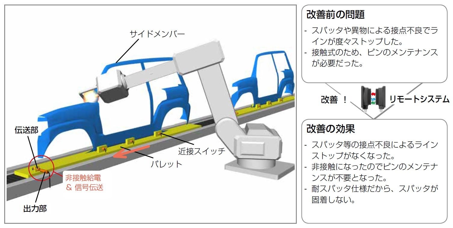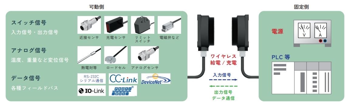 例えば、治具上、型上、インデックテーブル、搬送パレットなどで使用している近接センサや光電センサなど、各種センサへワイヤレスで電源を供給し、各種センサを動作させ、センサの検知信号をワイヤレスで伝送するシステムです。現在、国内の自動車メーカー様を中心に多くの実績があります。