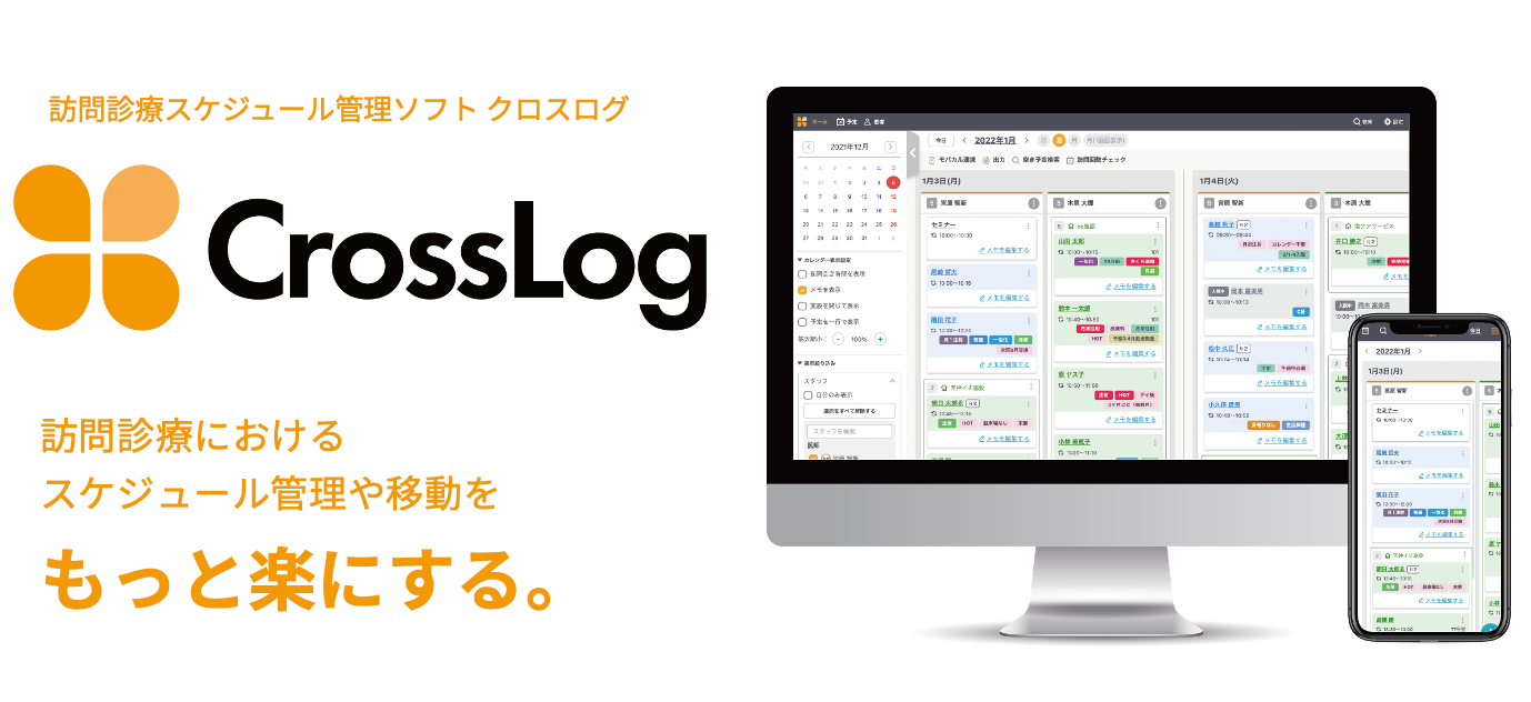 訪問診療専用スケジュール管理ソフトCrossLogは、訪問診療サービスを提供するクリニックのスケジュール業務効率化を実現するソフトです。