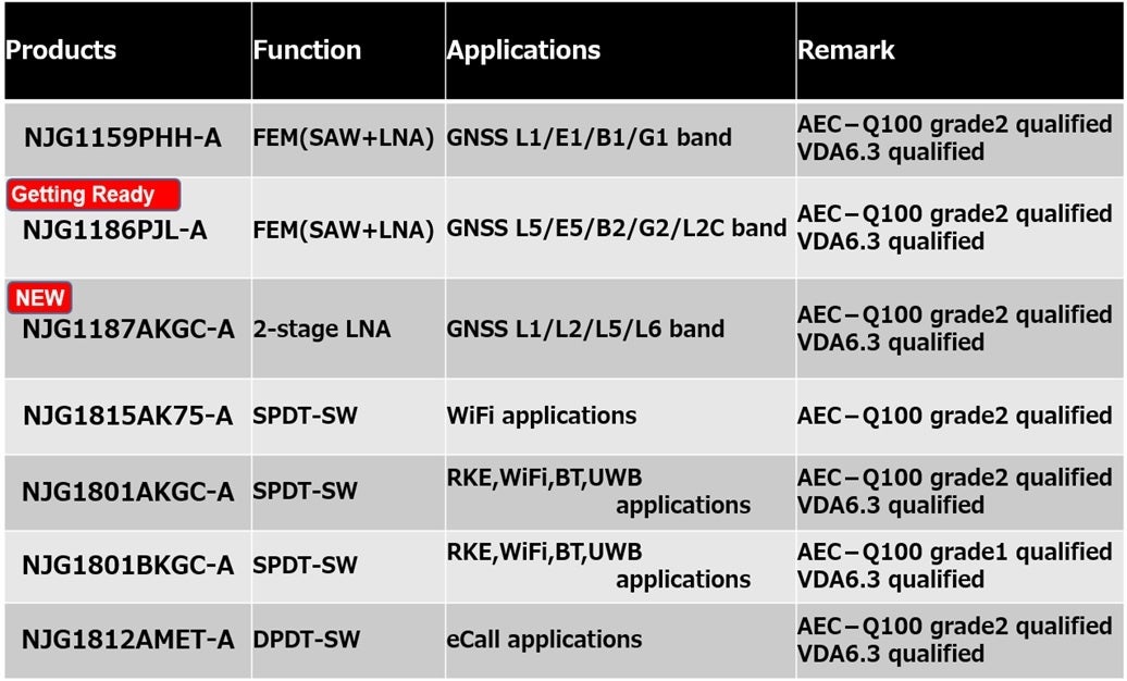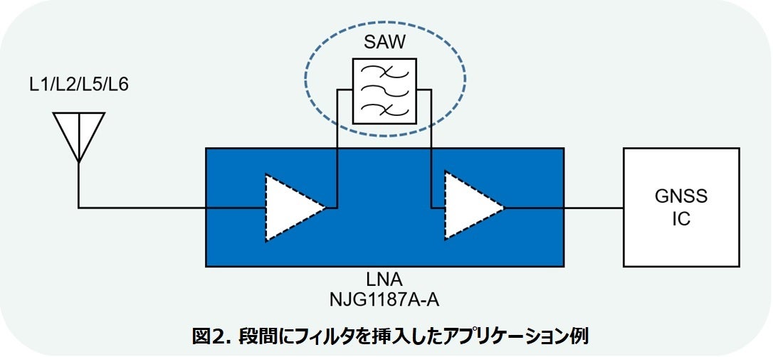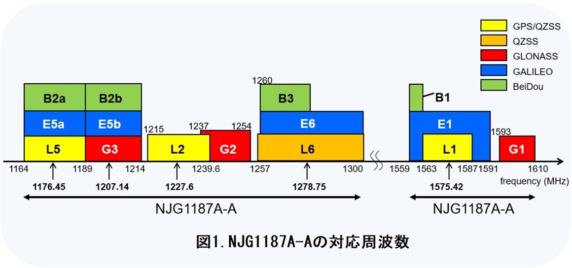 NJG1187A-Aは、1.5 GHz帯(1559~1610 MHz)及び1.1~1.2 GHz帯(1164 MHz~1300 MHz)で対応可能な、高利得かつ低雑音指数を特長とするLNA(Low Noise Amp)製品で(図1)、