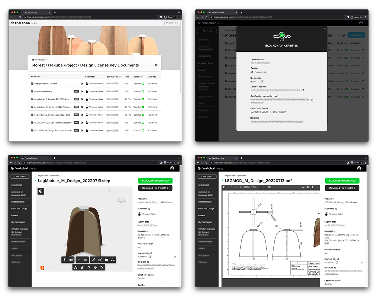 このような背景をもとにFinal Aimでは、ブロックチェーンやスマートコントラクトによるプラットフォーム「Final Chain」を開発し、デザインと製造業の契約書管理・執行の課題解決に取り組んでおります。デザイナーやメーカーが日々行う契約管理や業務プロセスの透明性・トレーサビリティ・耐改ざん性・自動化を実現し、管理コストやリスクの削減にくわえて、デザインやモノづくりといった本来業務での価値創造に専念することを可能にします。