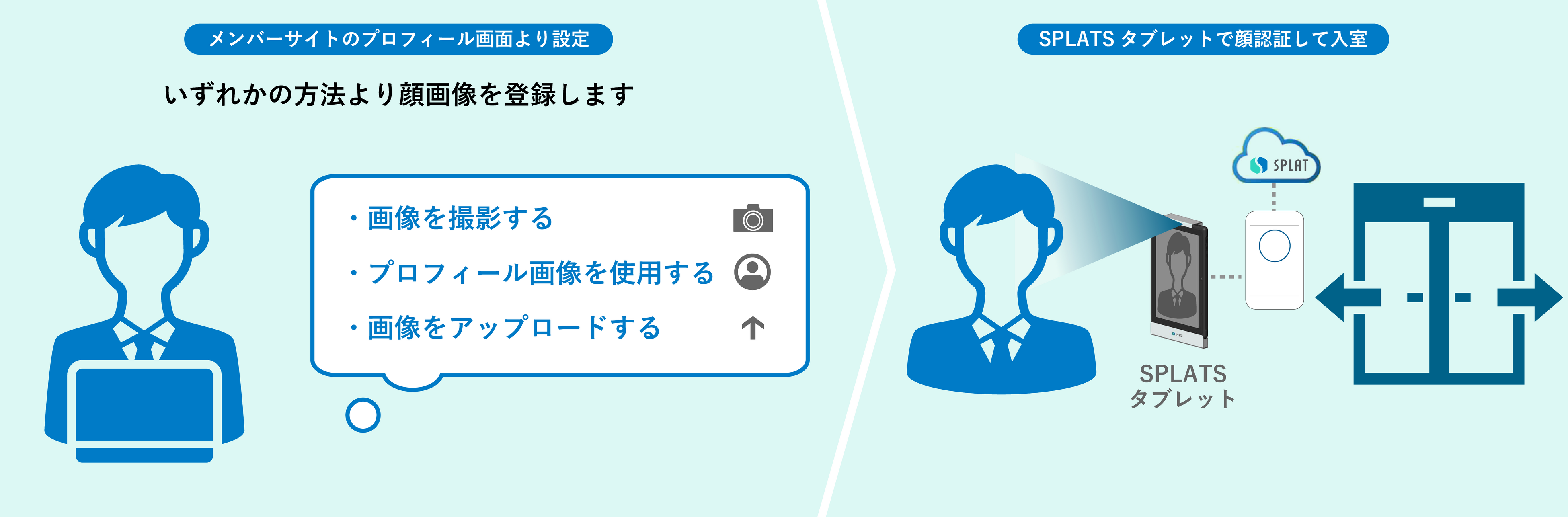メンバー設定のプロフィール画面より、画像撮影/プロフィール画像利用/任意の画像アップロードの方法から顔画像を登録します。顔画像が登録されたことを確認し「保存」をクリックし、SPLATS タブレットで顔認証すると入室できます。