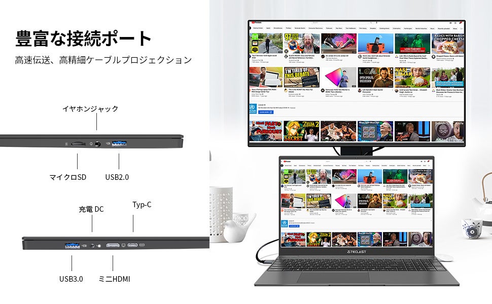 【豊富な接続端子とワイヤレス通信】F15 Plus 2 PCには、デュアルバンドWiFiとBluetooth 4.2、WEBカメラ、Type-Cポート、およびHDビデオ出力用のMini-HDMIポートが装備されています、3.5mmオーディオ出力、Micro SD スロット、3.5mm DCポート、1つの標準USB 3.0ポートとUSB 2.0ポート。802.11 acデュアルバンドWi-Fiは、高速ワイヤレスネットワークエクスペリエンスを提供し、低消費電力のBluetooth4.2はより多くの周辺機器に接続します。