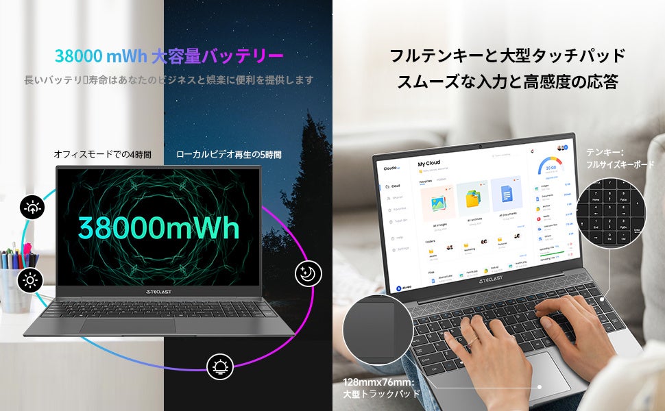 【15.6インチの薄型軽量の大画面】 TECLAST F15 PLUS 2ノートブックには、15.6インチの金属ボディを持っています、7mmの超狭額縁、1920×1080フルHD IPS大画面、91%の画面比率、完全に合わせられたガラス保護パネル、128mm×76mmタッチパッド、そしてテンキーデザインのフルサイズキーボード、キーボード入力をより効率的にします。14インチと比べて47%アップし、操作性も向上しました。38000mWhのリチウムポリマー電池搭載は、超長時間の総合使用を可能にし、より良い仕事と娯楽体験を提供します。金属ボディを使用、F15 Plus 2 PCは手に心地よく感じます。 また、重さはわずか1.65kgで、持ち運びに便利です。