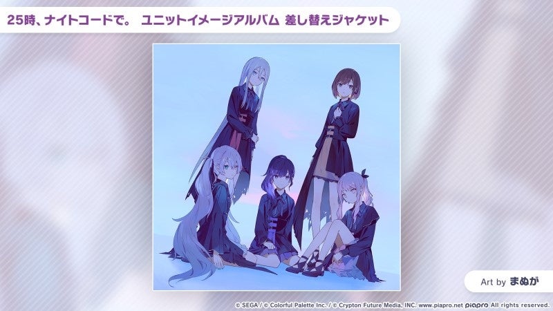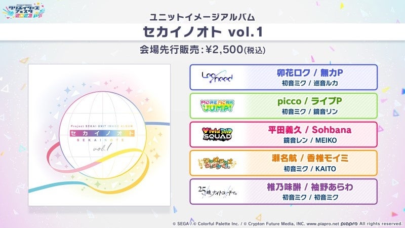『プロジェクトセカイ』に登場する各ユニットのイメージアルバム「セカイノオト vol.1」が、クリエイターズフェスタの会場で2,500円(税込)にて先行販売いたします。「セカイノオト vol.1」には、差し替えが可能な5種類のジャケットが付属しています。