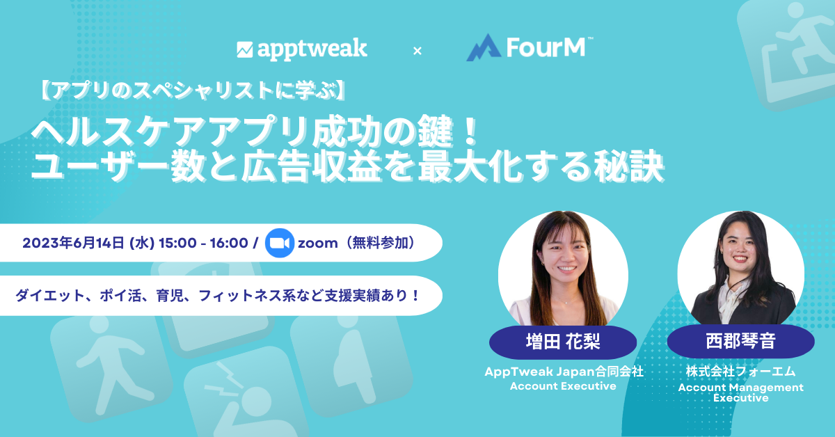 セミナー当日は、育児記録、オンライン診療、フィットネス、メンタルヘルス系などといったヘルスケアアプリのASO (アプリストア最適化) 支援実績を持つAppTweakと、婚活、ダイエット、ポイ活、生理系などのアプリ開発から広告収益最大化までを支援してきたフォーエムの2社で、ユーザー数と広告収益最大化の必勝法についてレクチャーします。