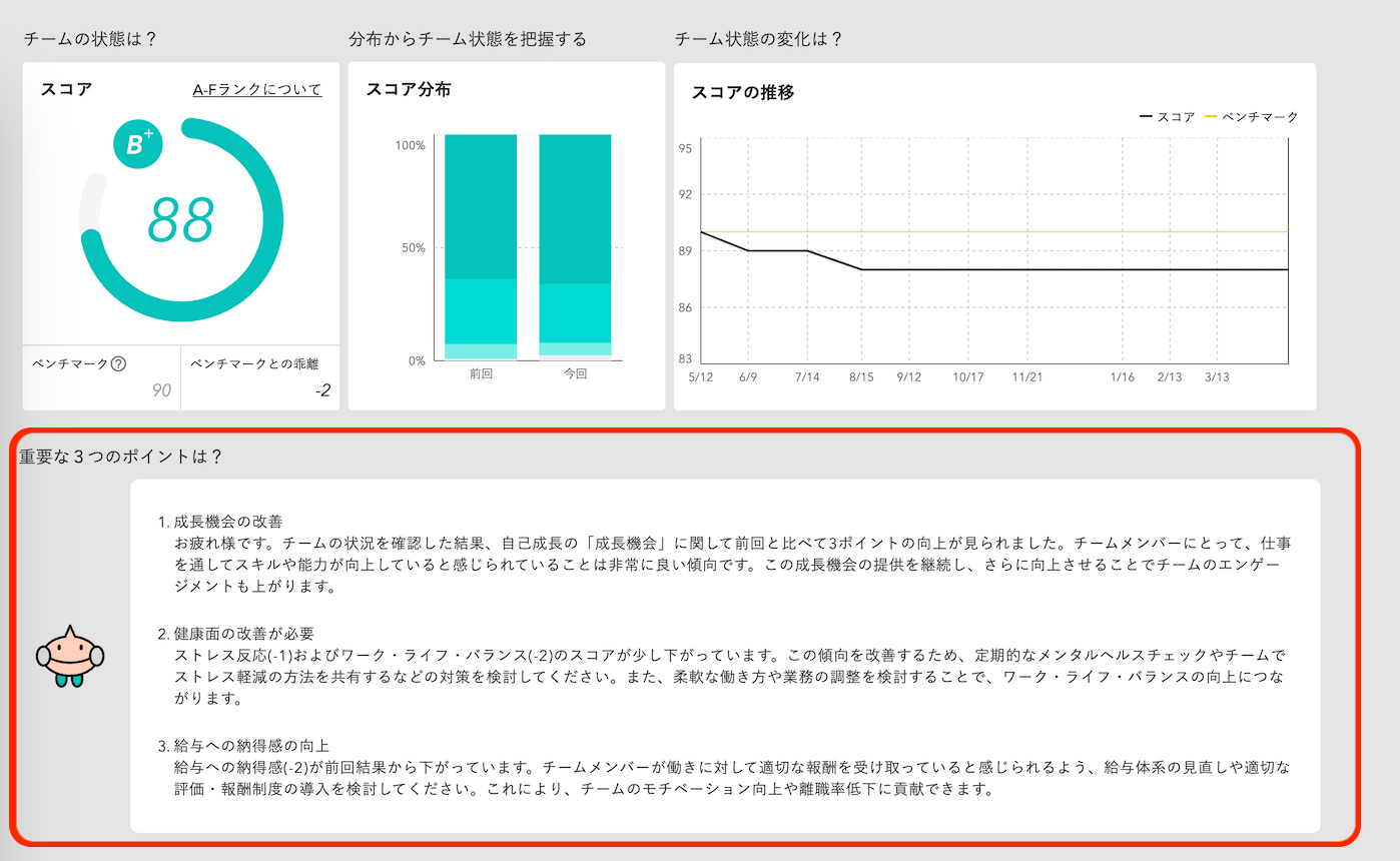 AIサポート機能とは、時間のかかるエンゲージメントスコアの読み解きや分析をAIが自動解析し、効率的にチーム状況を把握することが可能になる機能です。従来の影響度分析(組織ごとにエンゲージメントスコアの向上に影響度の高いものが分かる機能)など多角的な分析も掛け合わせて、各組織・各チームに必要なエンゲージメント向上活動をサポートします。