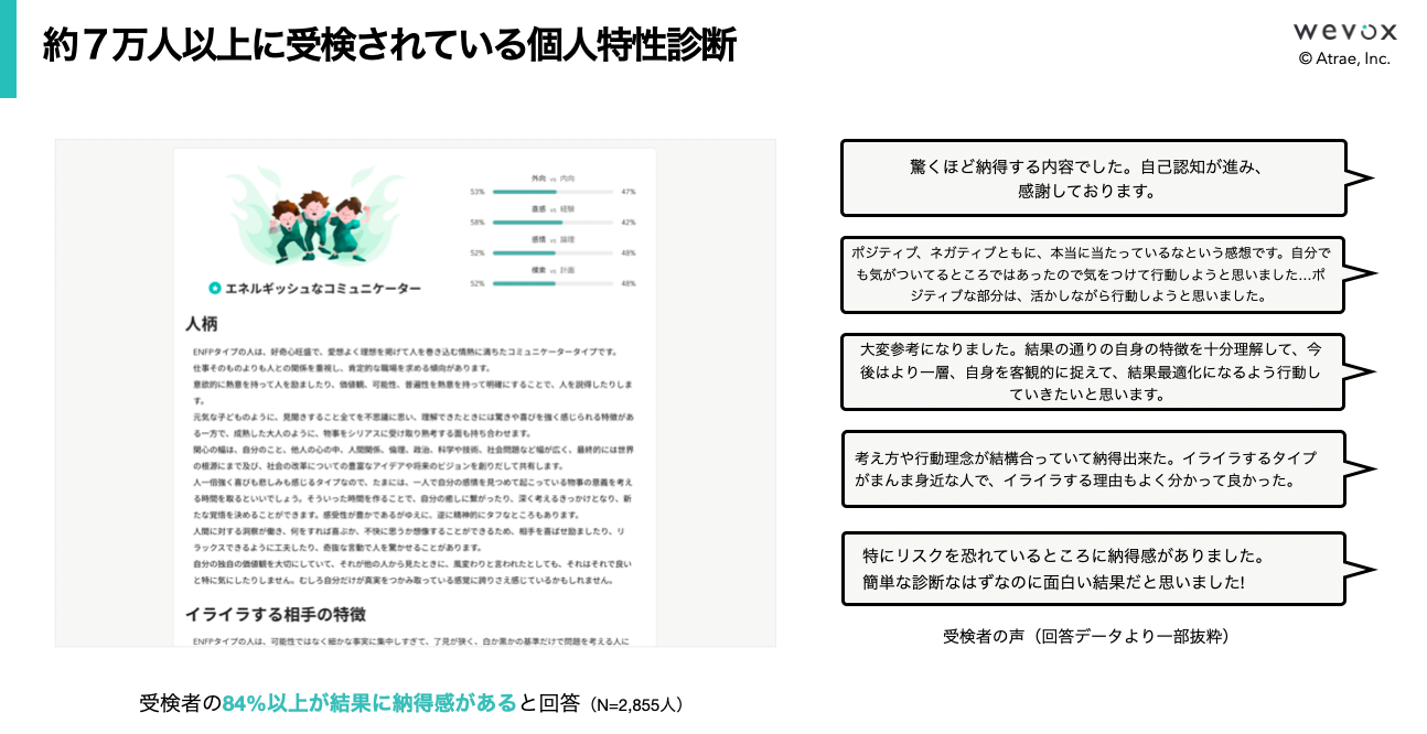 現在ビジネス領域のみならず、スポーツや教育の領域でも幅広く導入が進んでおり、導入組織・団体数は2,810以上、回答データは累計1.75億件を超える。2019 年度グッドデザイン賞を受賞。(2023年5月11日現在)