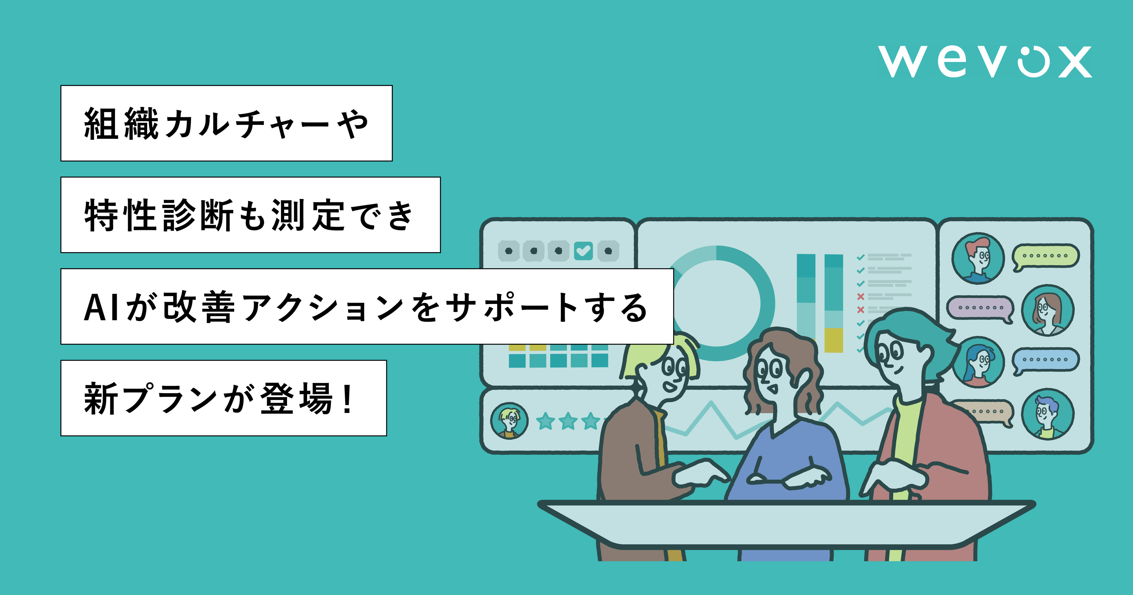 2017年05月のリリース以来、「Wevox」は多くの企業様の組織づくりやエンゲージメント向上に伴走してまいりました。エンゲージメントを「測る」だけでは終わらせず、そこから組織にどのような「きづき」が生まれるのか、どれだけ組織力向上につながるのかに徹底してこだわり続けてきたのが「Wevox」です。